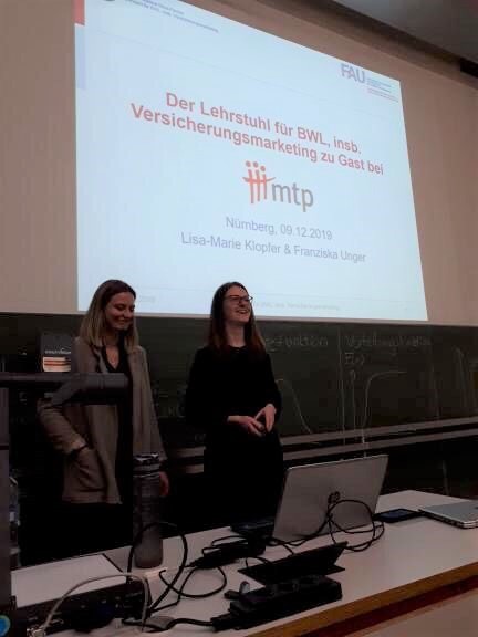 Frau Lisa-Marie Klopfer und Frau Franziska Unger haben am 09.12.2019 im Rahmen des MTP Plenums einen Gastvortrag gehalten. Dabei haben sie den Mitgliedern von MTP eine Einführung in das Dienstleistungsmarketing vermittelt sowie ihre eigenen Forschungsprojekte näher gebracht. Wir bedanken uns sehr herzlich bei MTP für diese Gelegenheit und freuen uns auf den weiteren Austausch im Rahmen unserer Förderprofessur.